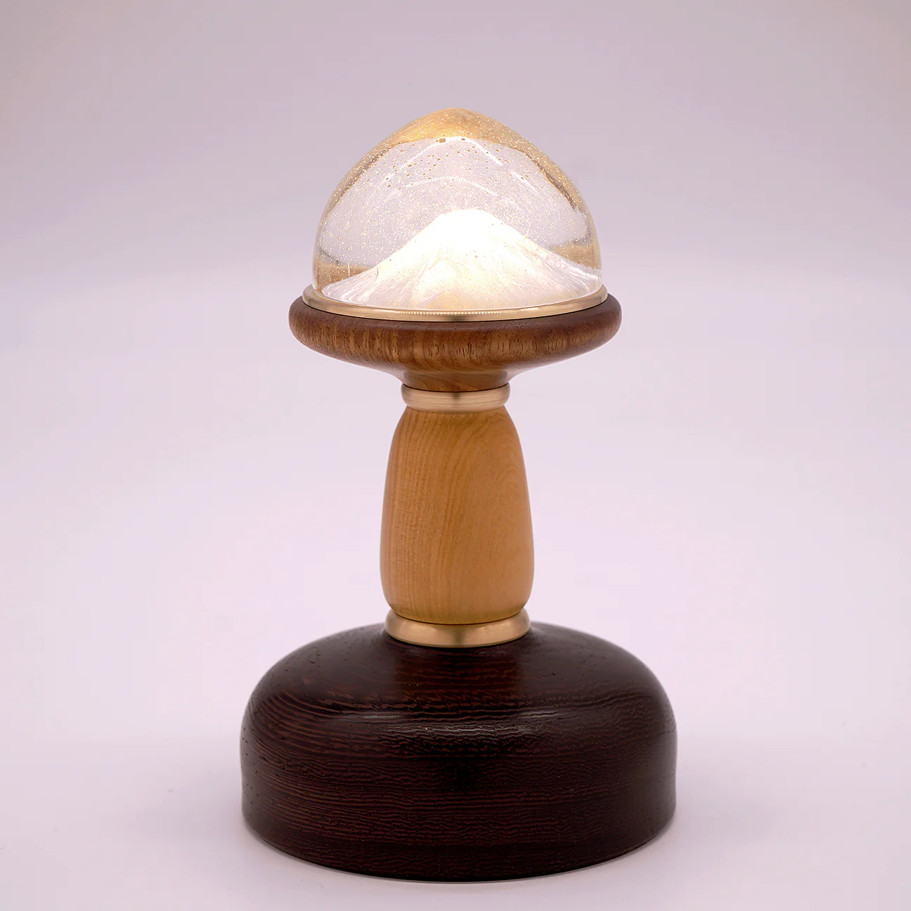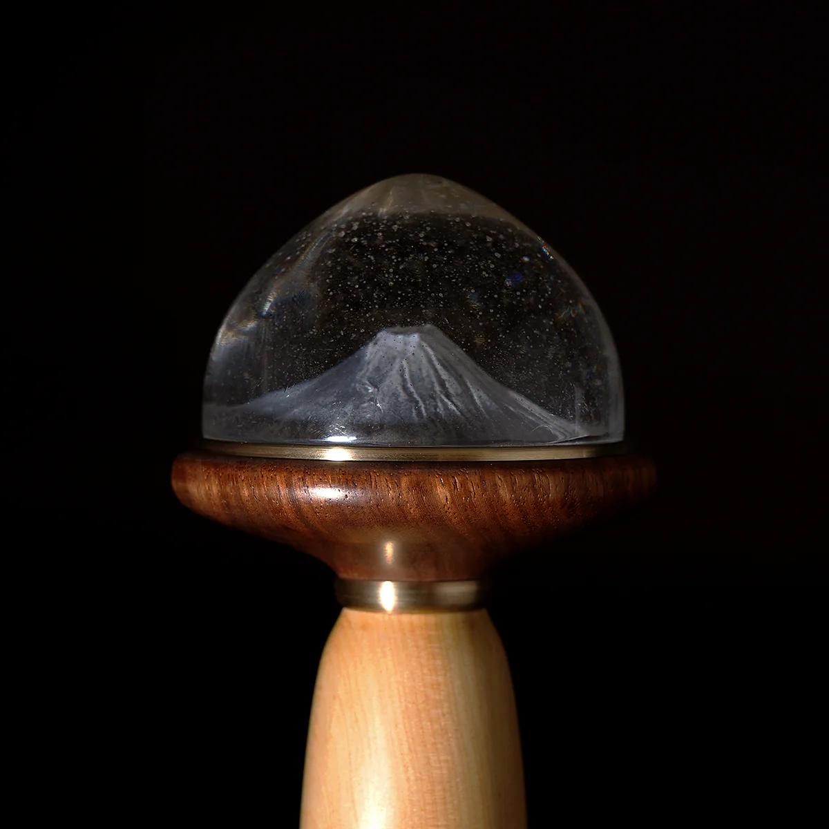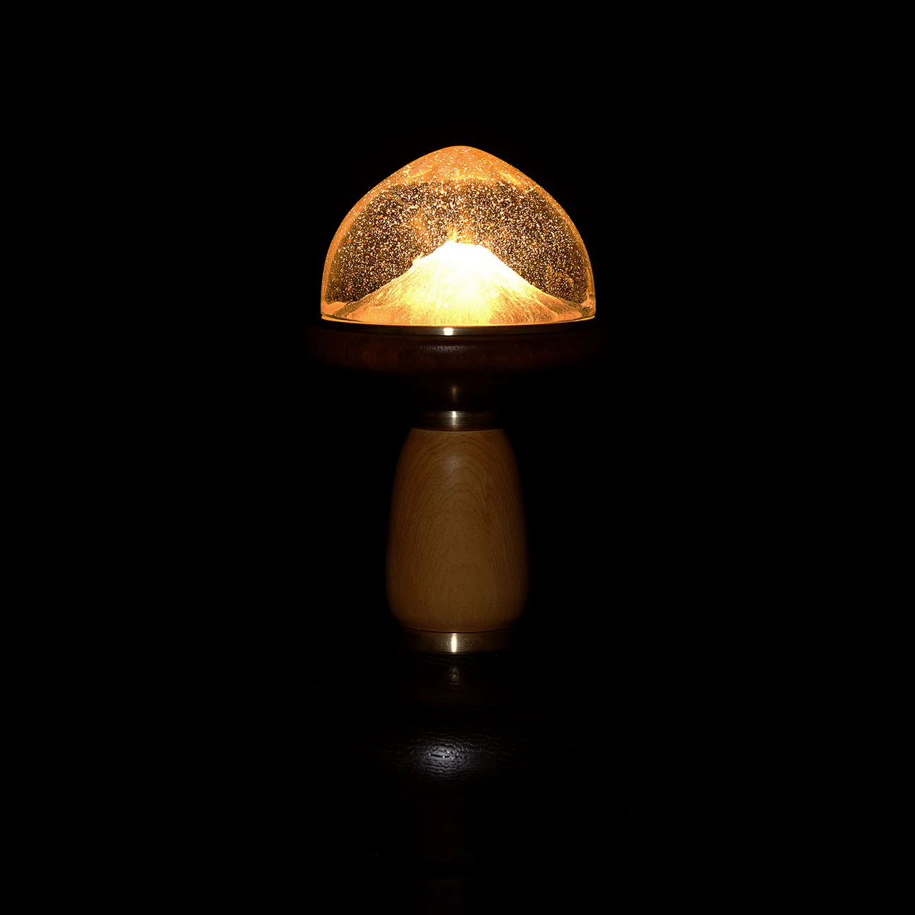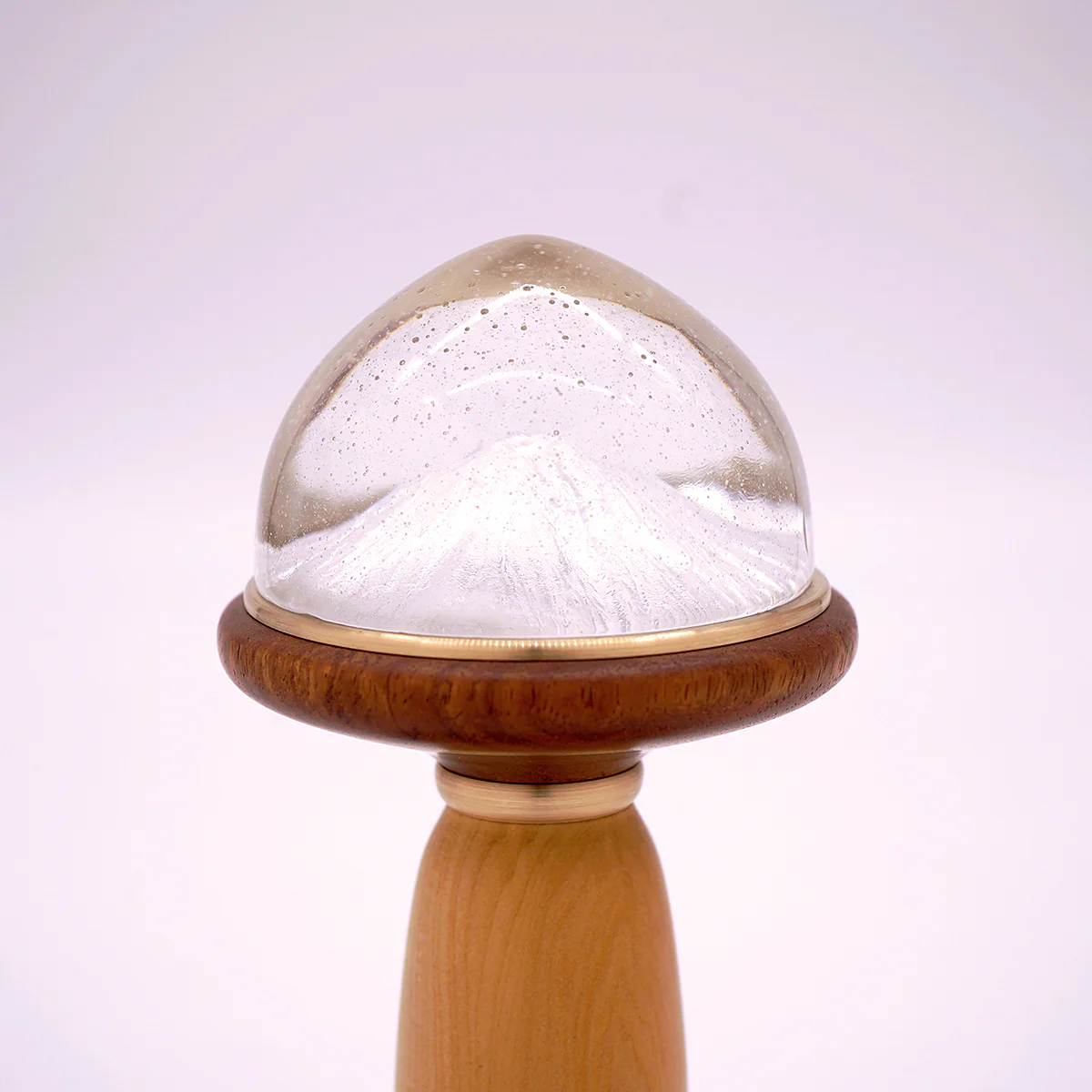 木の温もりに支えられた硝子の中で、雪は舞い、山は息づき、ひそやかな祈りのように光を放ちます。 それは、過ぎ去る時を愛おしみ、消えるものに宿る美しさを静かに語りかける灯火です。