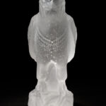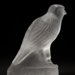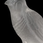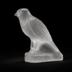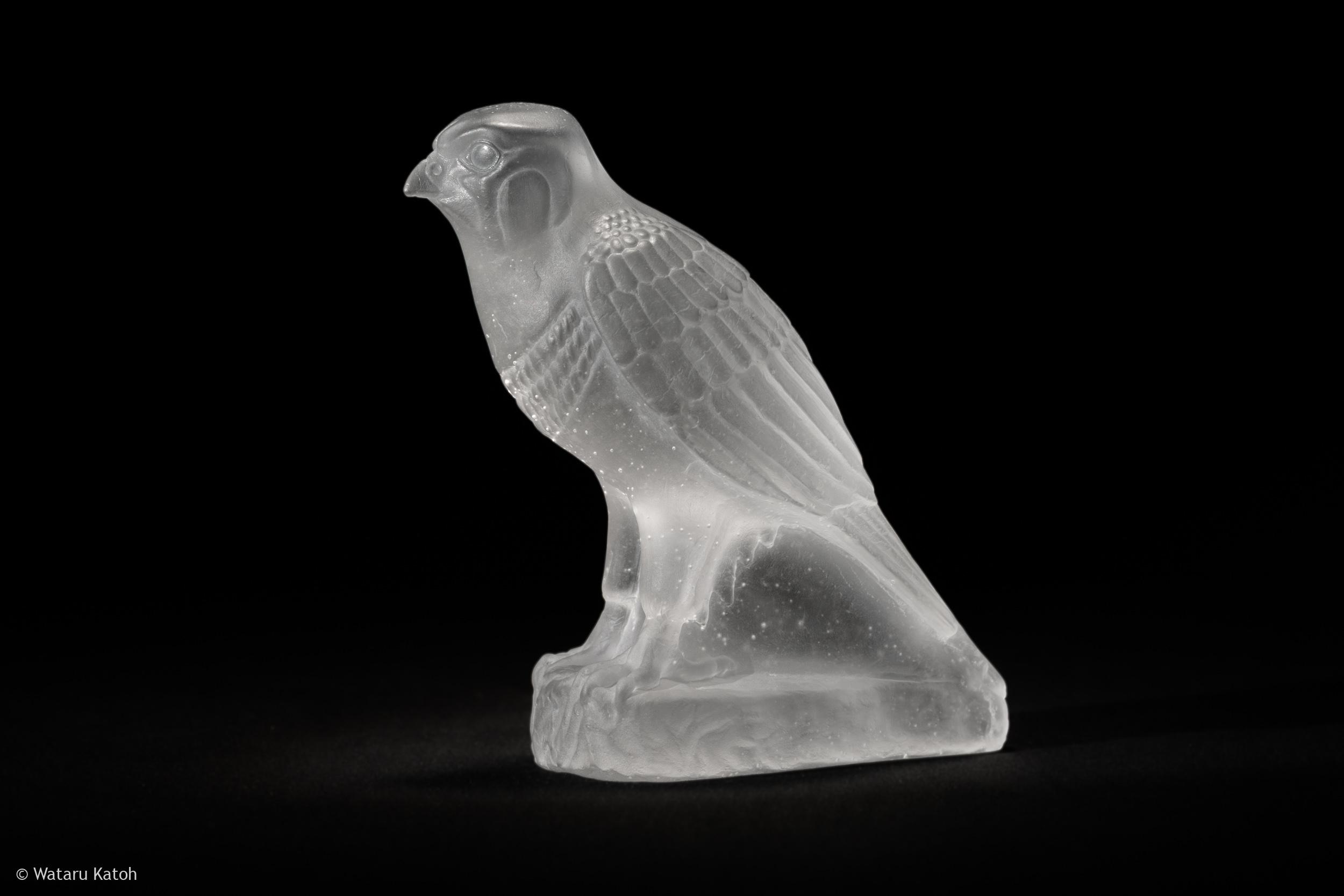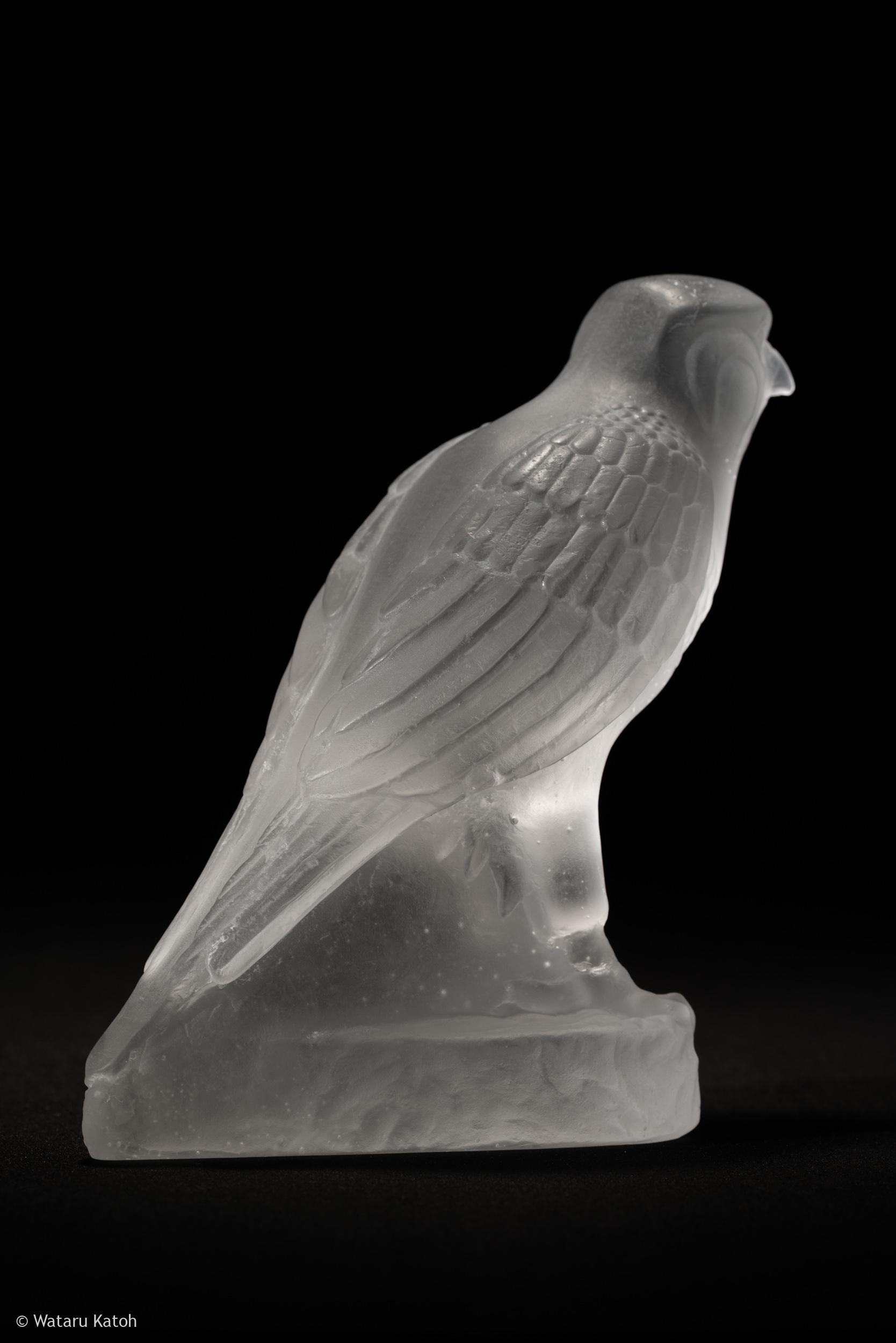 透明なガラスに刻まれた隼の姿は、古代エジプトの天空神ホルスの化身です。その身体は光を透かしながらも、どこか影を抱き込み、存在の二面性を示しています。