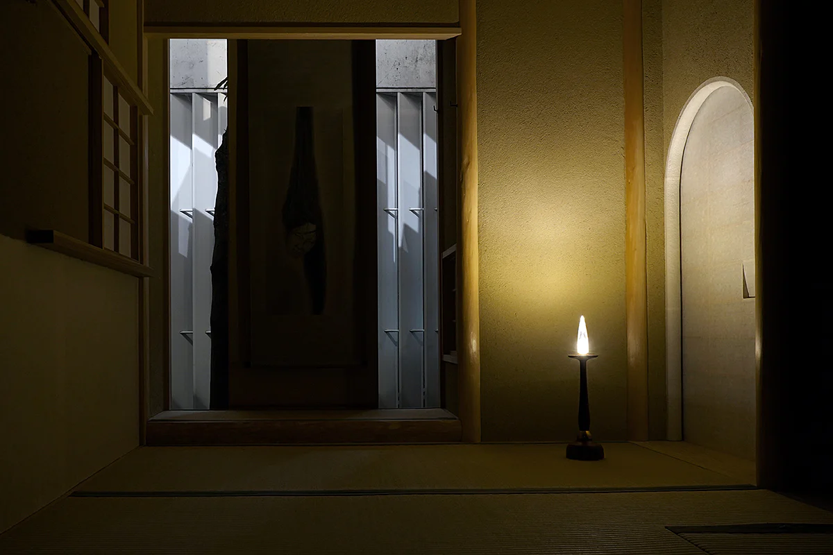 アクリルという硬質で透明な素材は、内部に封じ込められた形象を際立たせると同時に、外界の光を映し込み、見る角度や距離によってその表情を変えていきます。その変化は、夏の地平に漂う陽炎や、祈りの炎が放つ儚い光を思わせます。