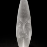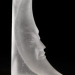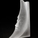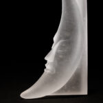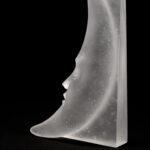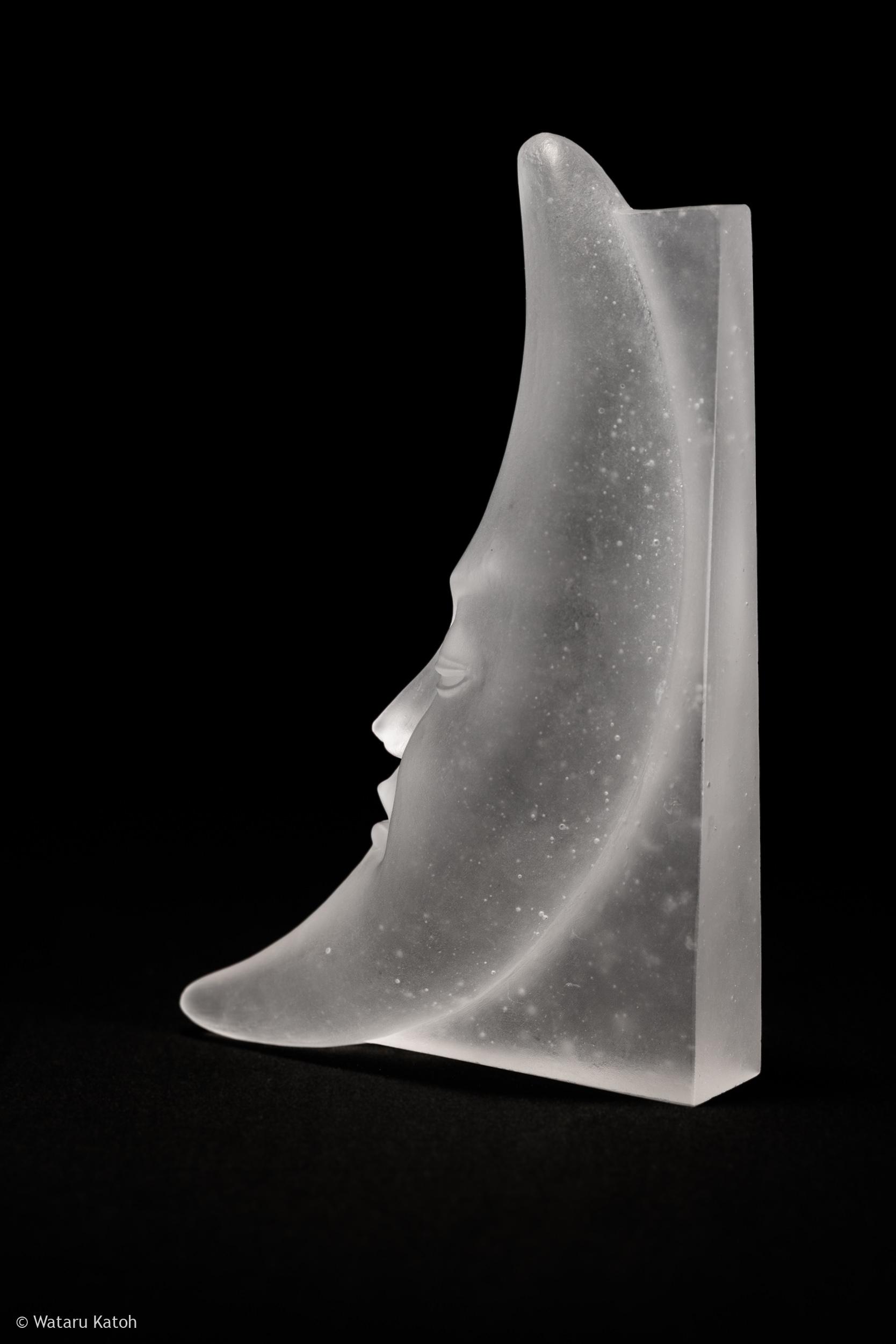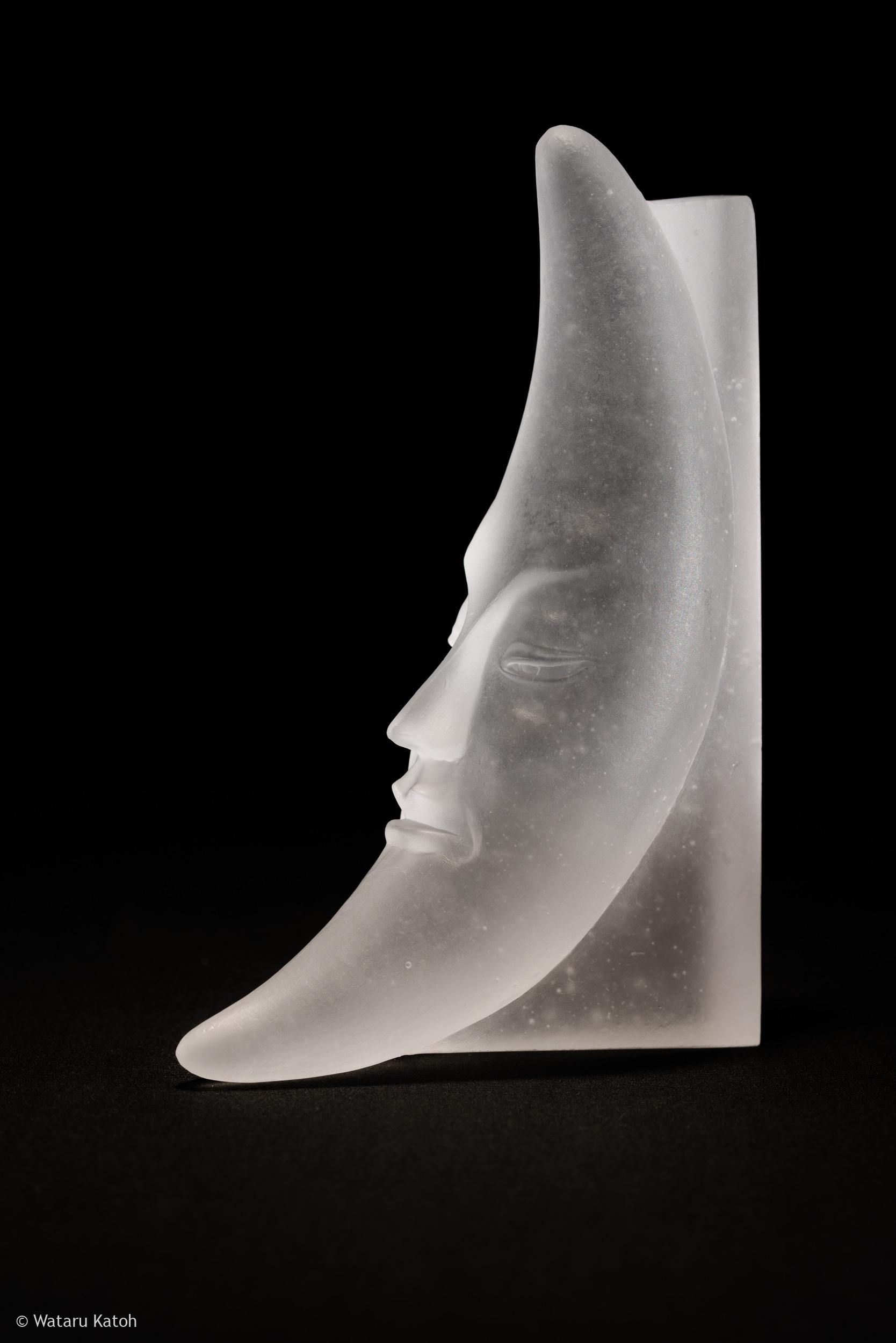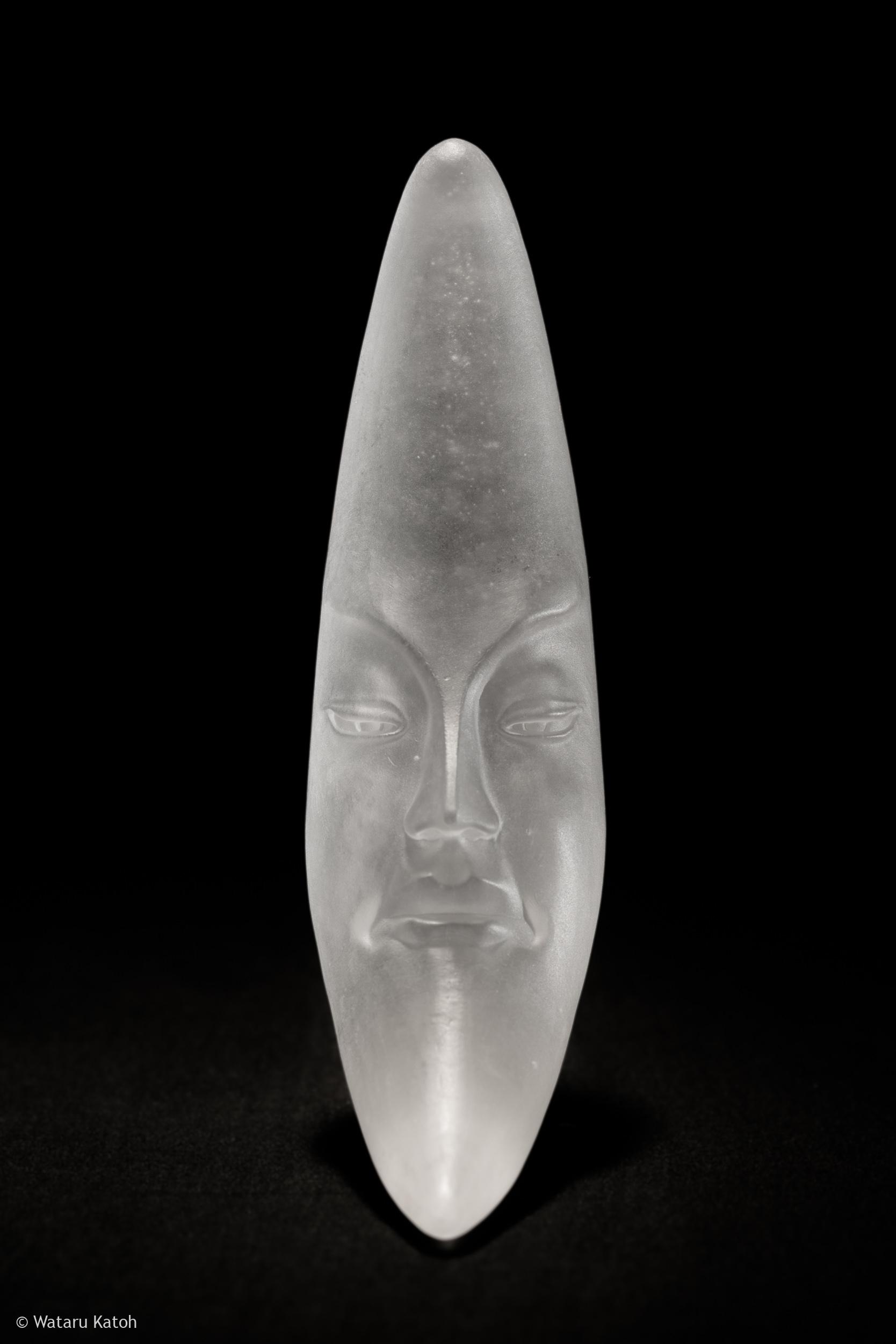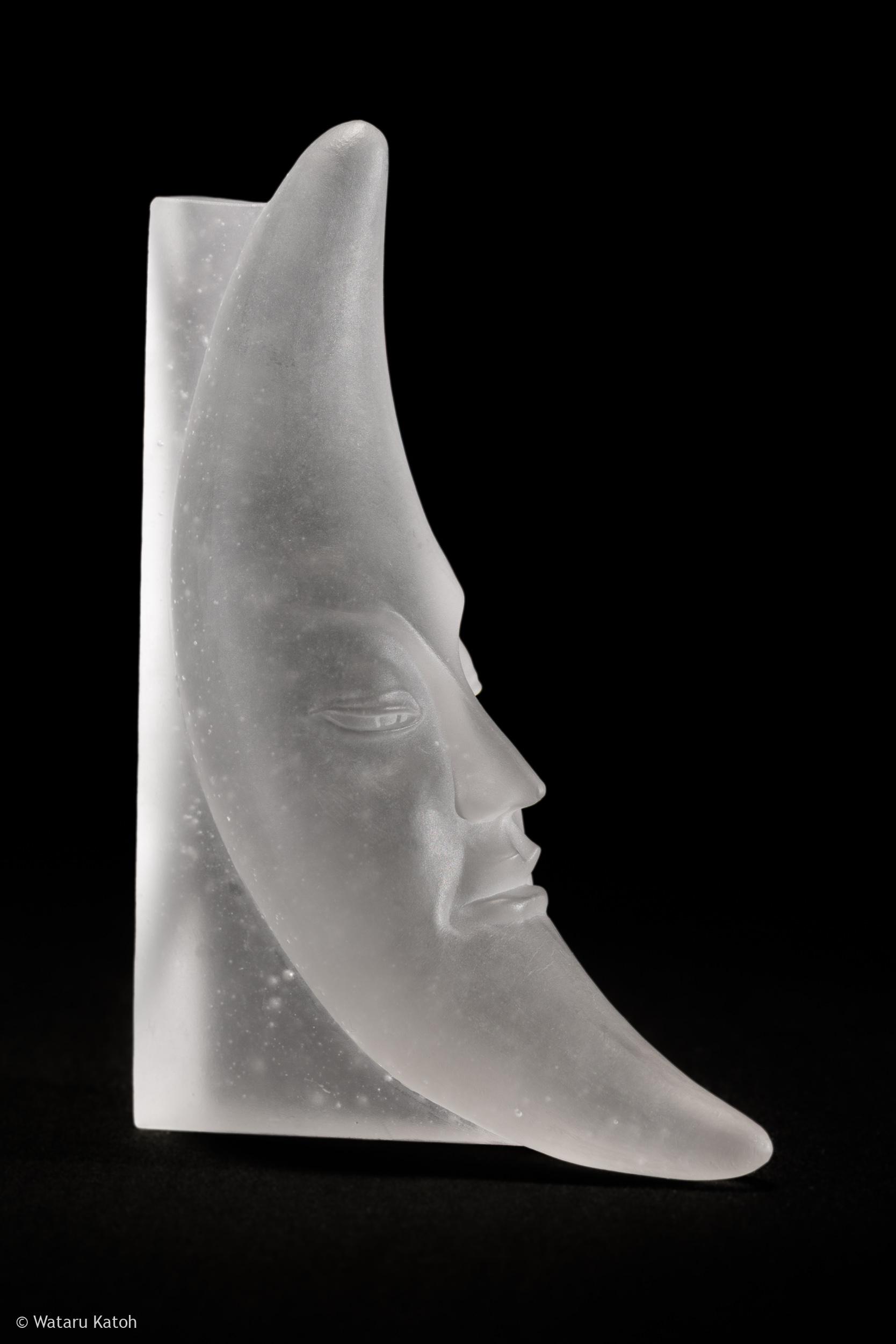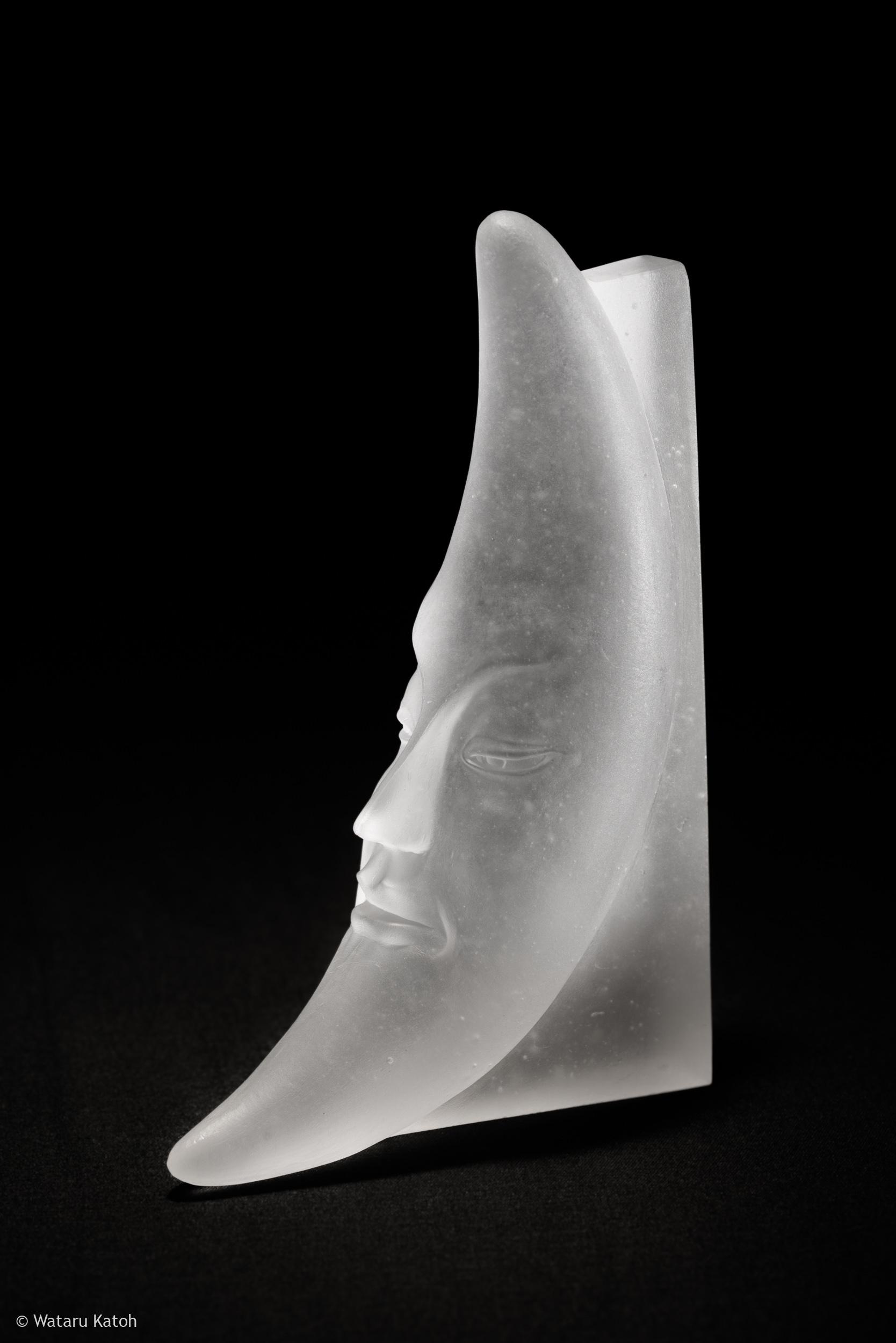 本作《朧の面》は、ガラスという透明で脆く、同時に強靭な素材を用いて、月の相貌をかたどりました。