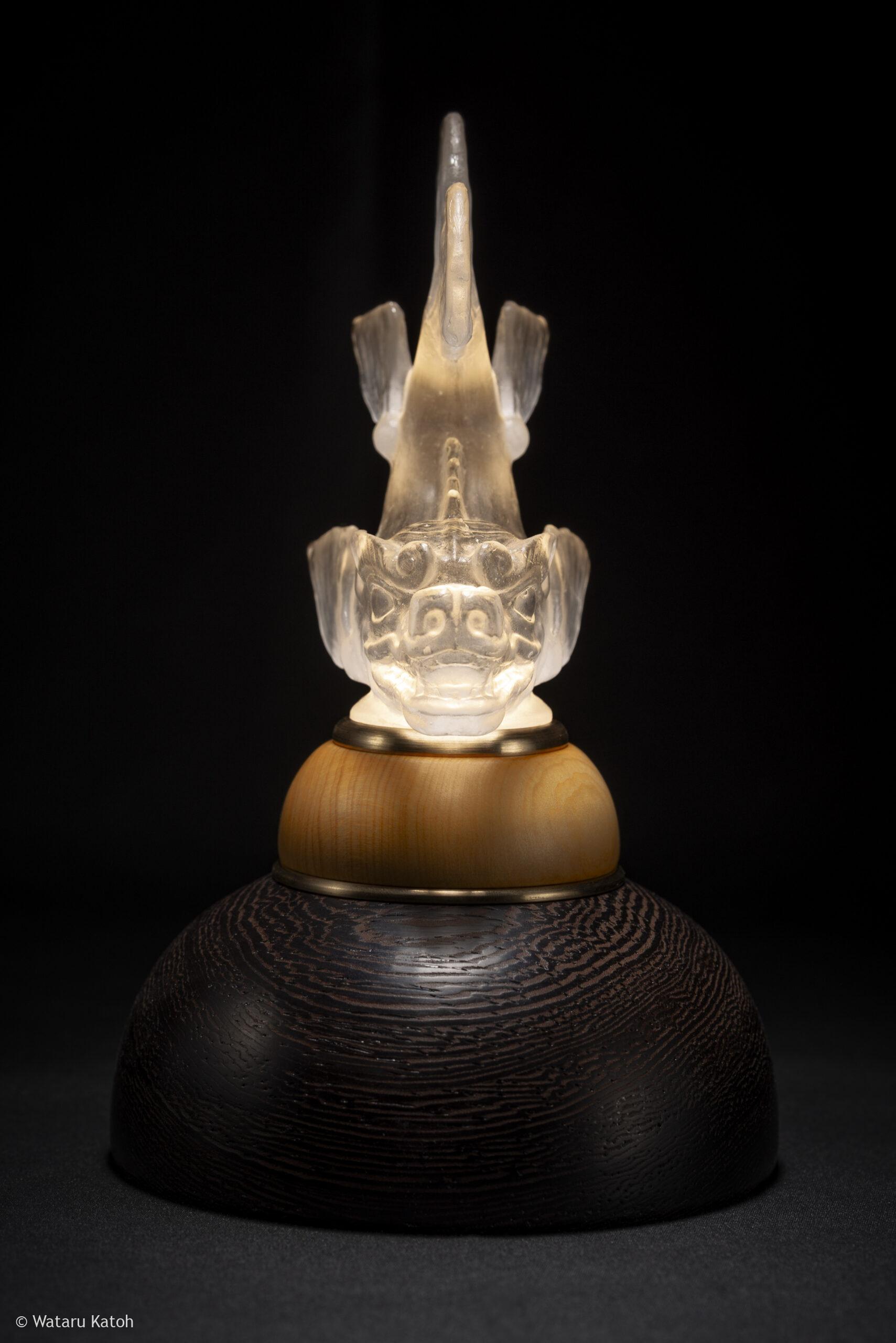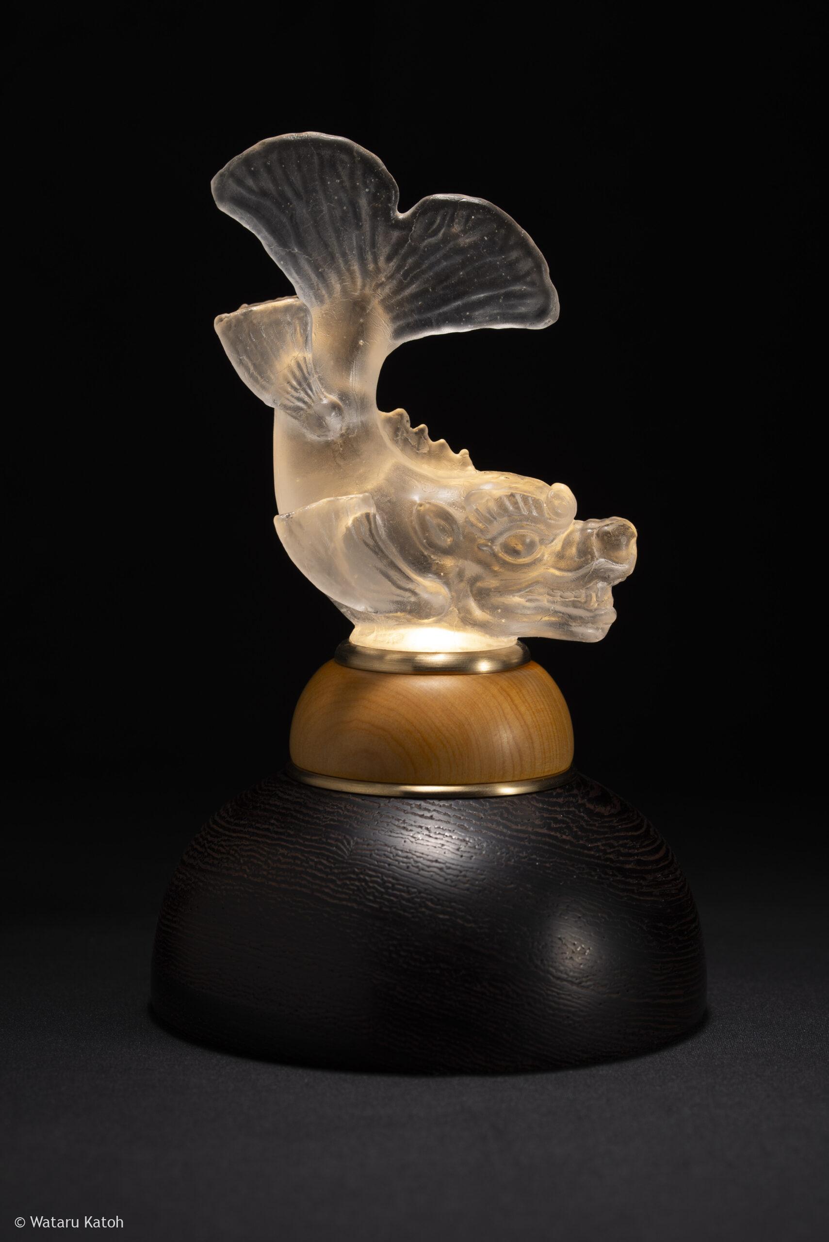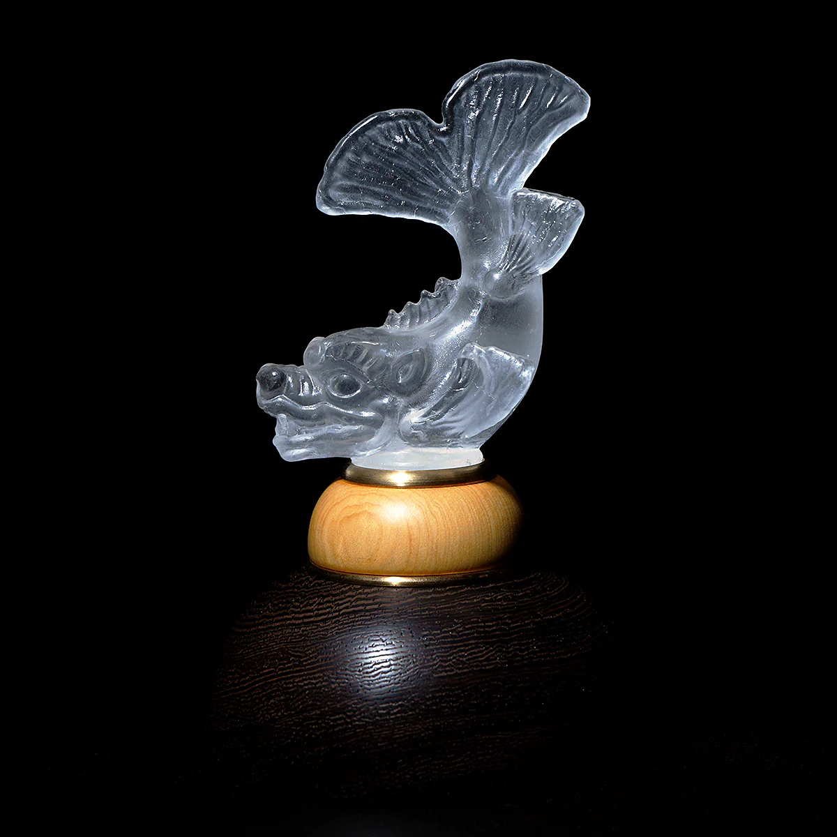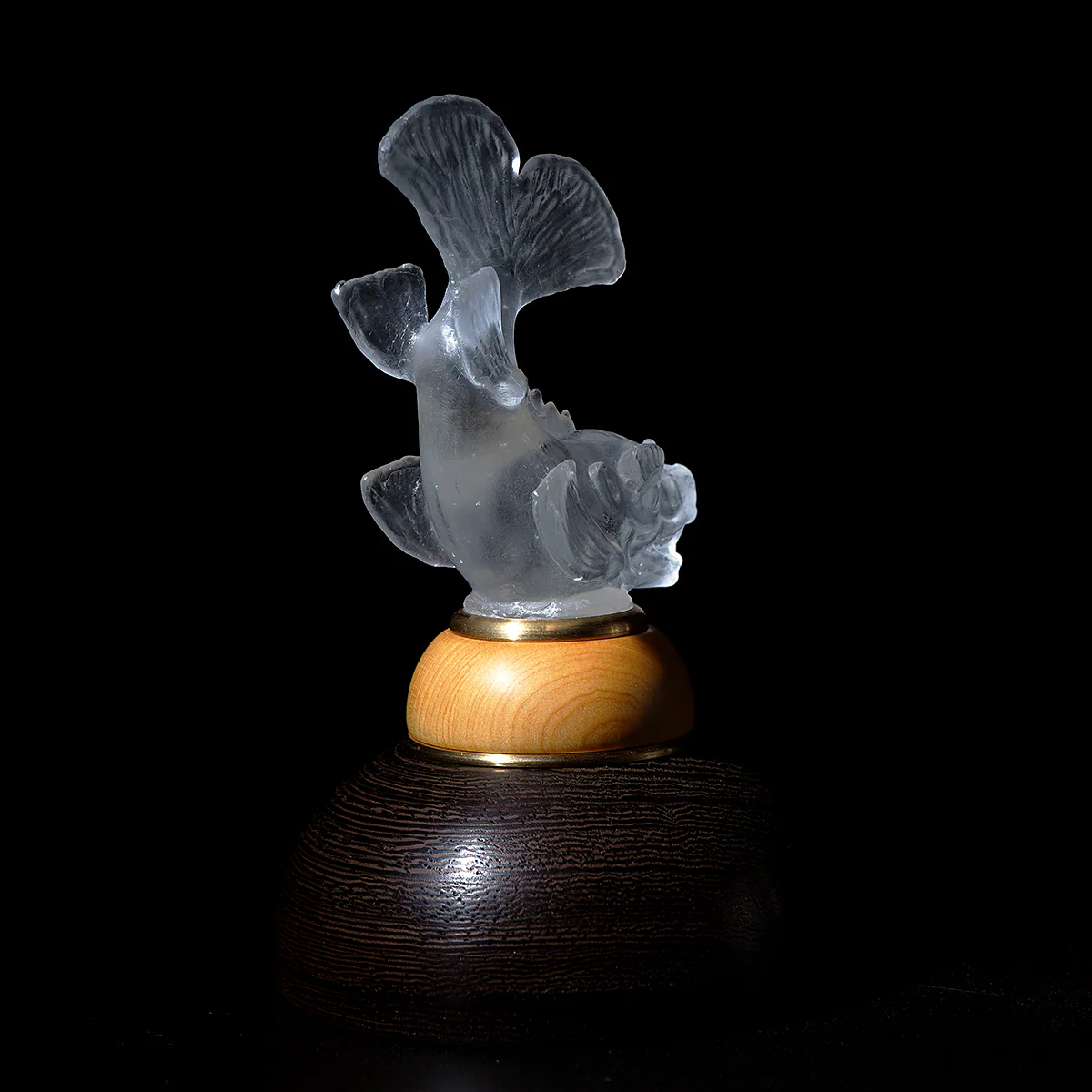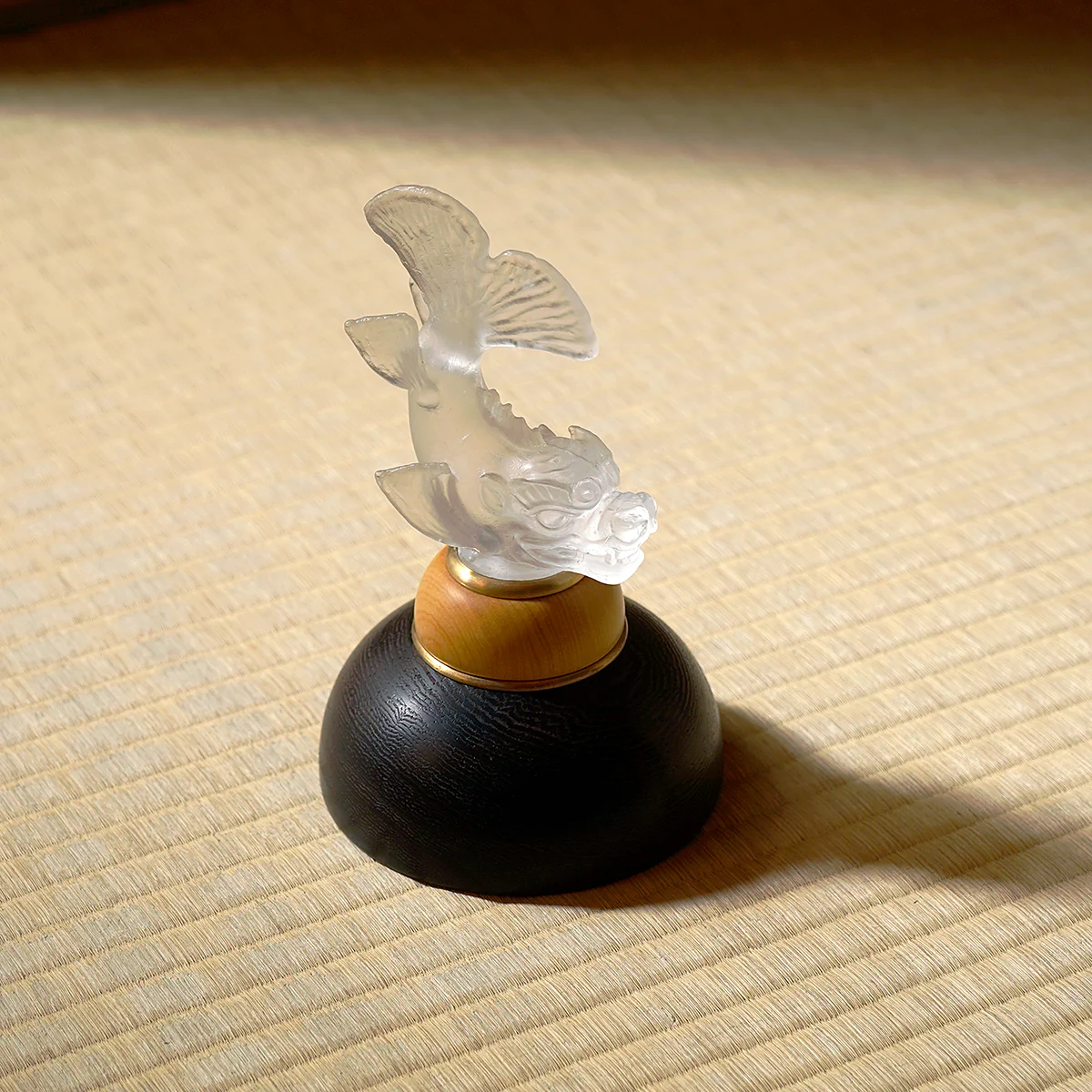 木材と真鍮の台座は大地の安定を示し、その上に跳ね上がる鯱の姿は、水の力を宿しながら空へと向かう力強さを表しています。透明な素材が生み出す光と影の変化は、鑑賞の場や茶席において静かな存在感を放ちます。